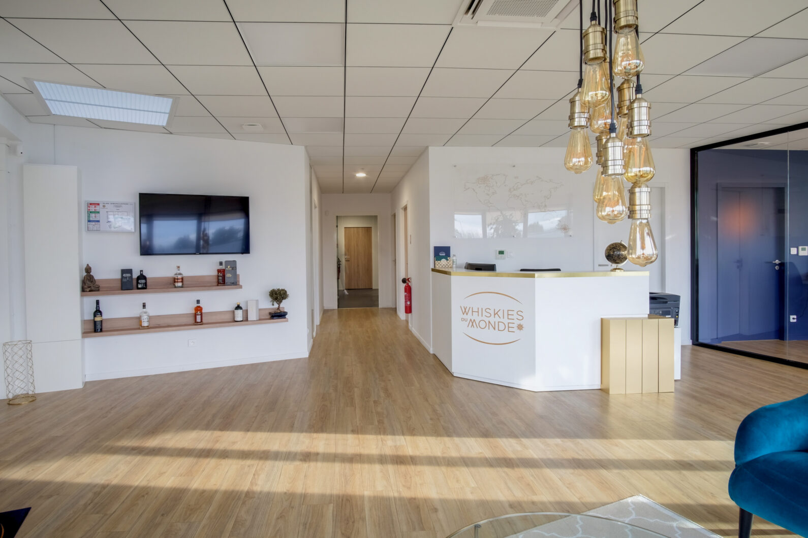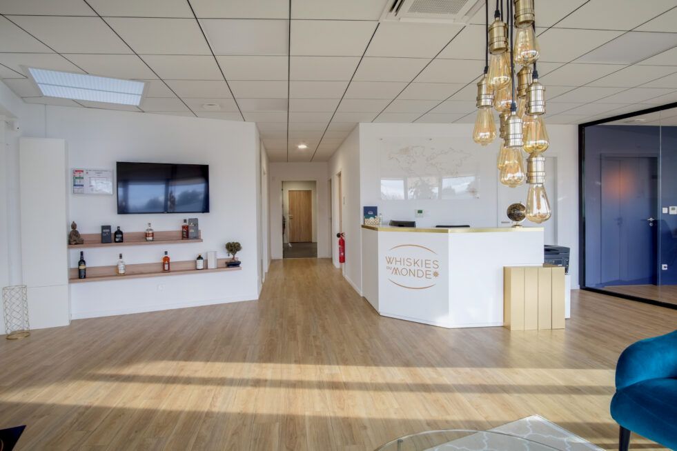 Le comptoir d’accueil reprend en lettres dorées le logo de la marque et sa fameuse rose des vents, qui représente le caractère international des produits et l’amour du fondateur pour les voyages. Un autre élément décoratif souligne cette passion : le planisphère doré, imprimé sur plexiglass situé derrière l’accueil. Soucieux de la mise en valeur de ses produits, un podium présente sous vitrine la bouteille du mois. L’espace d’accueil invite dès l’arrivée au voyage et à la découverte, à l’image des ambitions de la société.