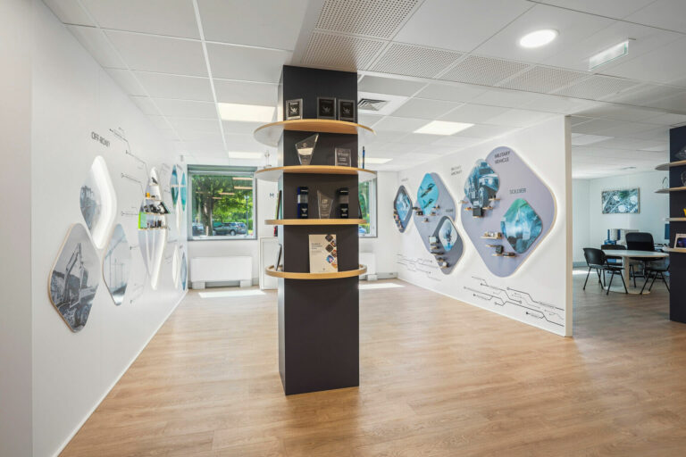 En intégrant des solutions digitales, en sectorisant les domaines d’activités, et en valorisant les produits, brochures et trophées, nous avons transformé ce showroom en une vitrine commerciale attrayante, offrant aux visiteurs une expérience immersive et informative.